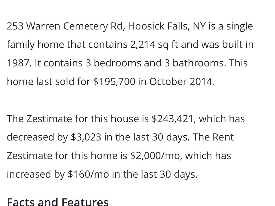 This 2214 square foot single family home has 3 bedrooms and 3.0 bathrooms. This home is located at 253 Warren Cemetery Rd, Hoosick Falls, NY 12090.