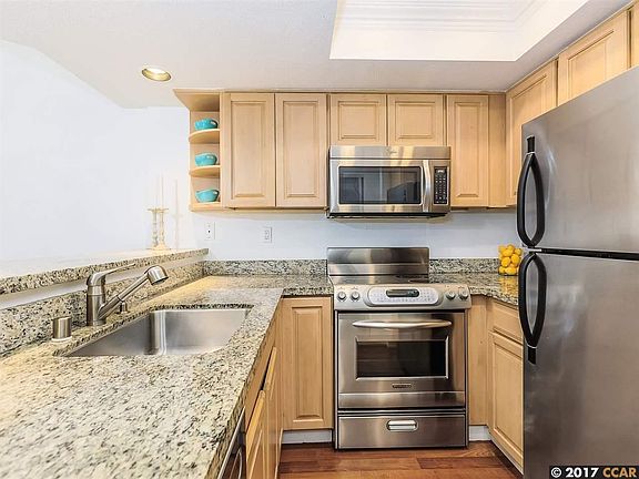 Coveted top floor corner unit with vaulted ceilings and large living room! Granite counters, stainless steel appliances, new carpet, custom closet organizers, balcony, pantry and extra storage. One car garage, fitness center, community pool and spa. Great WC schools! Walk to town and BART!
