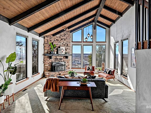 This unique home on the rim of Warm Springs Mesa, along a private lane, sits high above the Boise River valley amidst pines, fruit, and native trees. Enjoy the Oakley stone entrance, towering fireplace, and the floor-to-ceiling windows while gazing across the river valley and foothills. Retaining its original 1970s charm, the house’s electrical, plumbing, and heating systems have been upgraded. An inviting kitchen honors the home’s design and a light-filled dining area leads out into the natural landscape. The upper level provides 3 bedrooms, including a primary suite with a private balcony. The lower-level is an excellent area for guests or separate living quarters, complete with its own entrance, living room, (including wet bar nook that could be expanded to kitchenette), bathroom, and bedroom. The 1 1/3 acre property includes several serene sitting areas where you can relax and watch wildlife in your own backyard—a sanctuary with easy access to the Greenbelt, downtown Boise, foothills trails, and beyond.