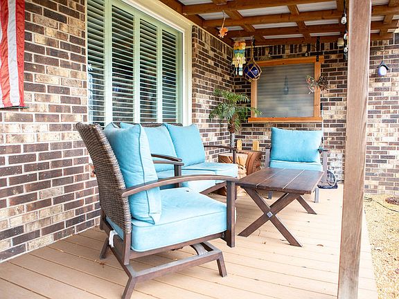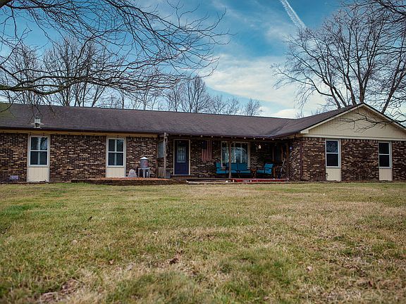 You will not want to miss this meticulously maintained brick ranch with appealing features to include a metal roof, new gutters, new windows with custom shutter blinds, updated kitchen and bathrooms, all sitting on just under an acre in New Palestine. The updated kitchen will wow you with new cabinets, granite countertops, an island for additional countertop/cabinet space, includes all kitchen appliances, and the added bar area is a great addition for entertaining. The family room is a great space with a gas log fireplace and built-in shelving making it cozy and functional. This a 3-bedroom home with 2 full baths. The primary bedroom has dual custom closets, and the primary bath has been updated with a stand-up shower. The secondary bathroom has beautiful tile work and concrete vanity top. You will also love all the outdoor features to include the covered porch and patio, a large backyard (property line goes to the creek), firepit area, water features, concrete driveway, 2 car garage (lighting and partial flooring has been added in attic), and an additional outbuilding.