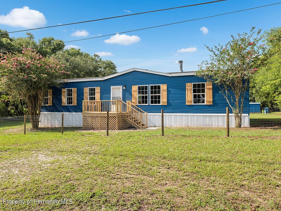 You are going to want to STOP THE CAR and see this property! This fully remodeled mobile home is absolutely stunning - with 3 bedrooms, 2 full baths, plus a flex room off the primary bedroom. With 1860 square feet of living space, this split open floor plan has been meticulously designed for comfort, convenience, and style. No HOA, No Flood zone, and situated on a large, cleared, corner lot with a newly installed fence spanning across over 1/2 acre of land (.66 acres). The details are hard to miss once you're inside - the wood burning fireplace with a beautiful custom mantle, accent walls in the dining area, new luxury vinyl plank flooring throughout the entire home, recessed lighting in the kitchen and dining, pendants over the island, and a chandelier in the dining area. The kitchen is a chef's dream with custom butcher block counters, brick backsplash, a large island, and plenty of natural light streaming in. New appliances, new cabinets, and custom over-cabinet lighting are just some of the features that will catch your eye. The bedrooms are spacious and bright, with LVP floors, LED ceiling fans, and walk-in closets in each room. The primary bedroom and bath feature barn doors leading to the bathroom closet and the large flex room that can be used for a number of purposes - perfect for an office, nursery, or dressing room. There is also a dedicated laundry room with washer and dryer included. The bathrooms are also, of course, amazing - the primary on-suite bath features a walk-in shower, dual sinks, a gorgeous soaking tub, upgraded fixtures, and a beautifully remodeled design with incredible toe-kick lighting under the vanity! The second bath also features new vanities with matching customer counters and fixtures. Both bathrooms also have new toilets, and custom exhaust fans with Bluetooth enabled speakers. Outside, the large corner lot offers plenty of space for outdoor fun and activities. There is also a shed on the property to store your outdoor toys, lawn equipment, and tools. The home has all new skirting, is newly painted, new shutters, and two brand new decks in the front and back. The fence was also just installed with brand new posts and materials! Oh, and let's not forget to mention a BRAND NEW roof (2024), AC (2021), hot water heater (2024), new electrical service inside and outside with new pole/meter/panel (200 amps). The septic was also just pumped in 2024. This location offers the best of everything! Quiet, rural living, with a boat ramp and Lake Bystre across the street, AND only 10 minutes to Historic Downtown Brooksville. Don't miss out on this opportunity! Schedule a showing today and see for yourself why this is the perfect place to create lasting memories with your loved ones. **One or more photos has been virtually staged**