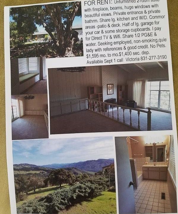 Property Id: 152916 Studio suite in large Carmel mid Valley home. Private entrance, private bathroom,garage parking, gardener. Kitchen and W/D priviledges. Seeking only an employed, quite, non smoking gal. No partners, children or pets. Must have good references and good credit. Gorgeous views from every window, country living but only 17 minutes to Carmel by the sea. $1, 595 mo.$1,400 security deposit. Available Sept.1st