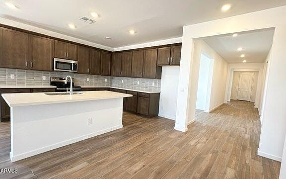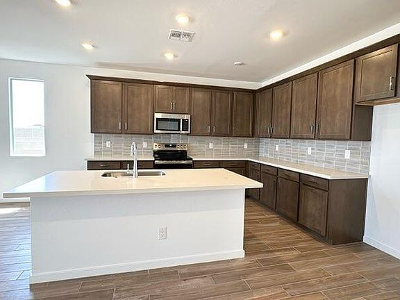 Discover your dream home! Move-in ready. Popular, split floor plan with mother-in-law suite, flex room, all four bedrooms are spacious, 9' ceilings throughout. Impressive entry/foyer, 8' interior doors, bathrooms are so roomy and include quartz counters, upgraded carpet in bedrooms and closets! A flex room for office/formal dining/game room, and secondary suite/bedroom split and private! Open concept, ideal for family and entertaining. The kitchen is a chef's dream, complete with 42'' Burlap cabinets adorned with chrome pulls, stylish brick look backsplash, beautiful quartz countertops, stainless steel appliances. A large kitchen island with breakfast bar and a single bowl sink, huge walk-in pantry. Big laundry room, Smart Home, soft water loop preplumb. Wood look 6''x36'' staggered tile!