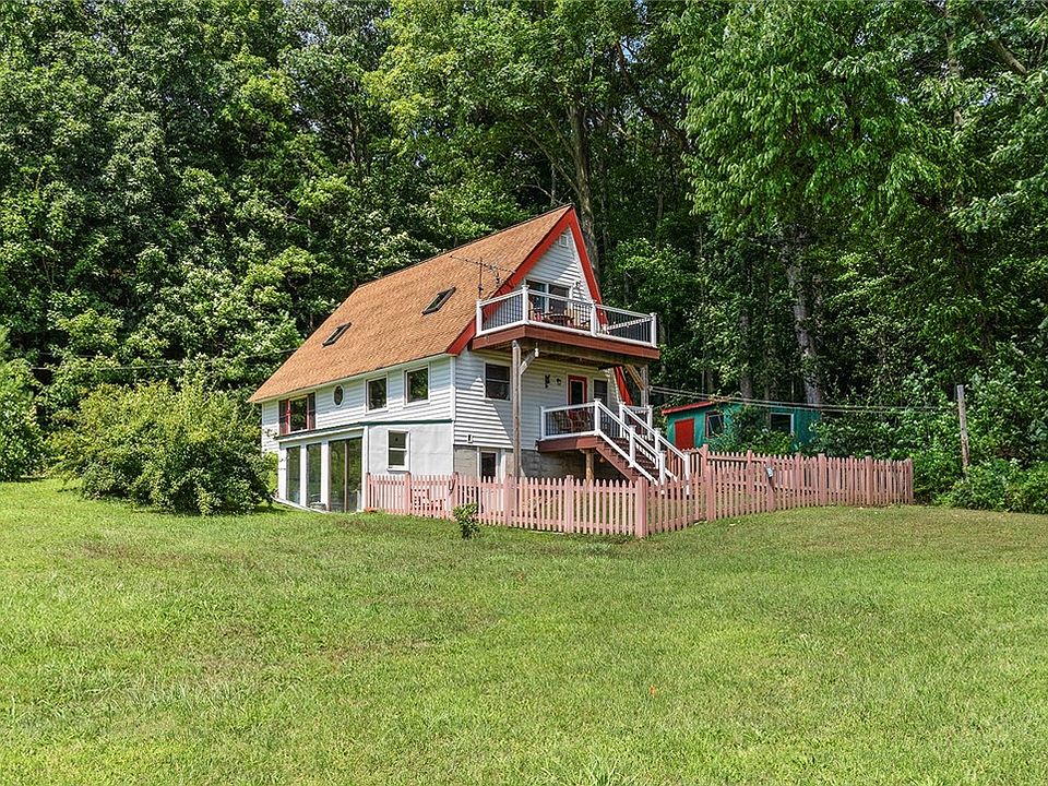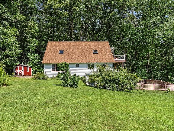 Welcome to 2531 Ayers Road — a charming A-frame bungalow perched on a private 5-acre parcel with peaceful woods, wide-open lawn, and peek-a-boo views of Keuka Lake. Inside, the cottage features an inviting open floor plan filled with natural light, wood floors, and a cozy kitchen/dining area with big windows that frame the surrounding greenery. The main level also includes a full bathroom and a convenient laundry/storage room. Upstairs, you’ll find two bedrooms, a half bath, and sliding glass doors that open to a balcony — the perfect spot to sip your morning coffee while enjoying serene lake views. Step outside to explore the spacious lot, complete with mature apple trees, a mix of lawn and woods, and plenty of room for outdoor fun. A fenced yard, fire pit area, newer deck, and an attached cold storage room/greenhouse make for convenient outdoor activities & relaxing. This home is less than 10 minutes drive from Keuka Lake State Park, Penn Yan, wineries, breweries, and everything else you need! Whether you’re looking for a relaxing weekend getaway, a home base to enjoy the Finger Lakes, or even a year-round residence, this property is ready for you!