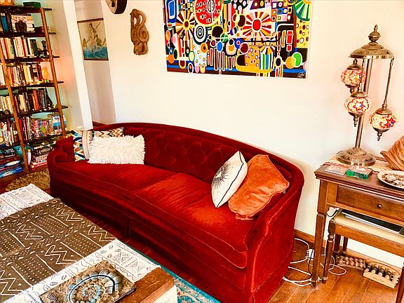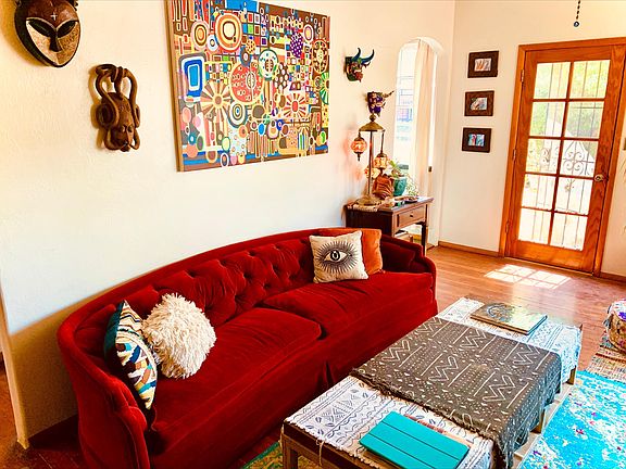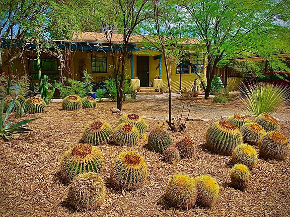 This is a WOW house! An Historic Mid-Century Bungalow tucked away on a cozy cul-de-sac street with stunning and thoughtful architectural design elements by an award-winning architect and former owner. This 2 bed/1 bath with bonus room, is gorgeous inside and out, with wood and tile floors, 10' ceilings, beautiful archways, wall niches, skylights, and a master bedroom with incredible wood-textured and poured-concrete accent walls, window seating with stowaway wooden drawers and recessed lighting. Stylish kitchen with gas range, and newer stainless-steel refrigerator and dishwasher. Outdoor Living features include mature trees and low-maintenance desert plants, built-in underground leach field, garden-ready 2500-gallon rainwater harvesting cistern, patterned-concrete front patio with shaded skylights, relaxation deck with views of Catalina Mountains, architectural play gym, workshop, cantilevered carport, and newer A/C and gutters. This home is truly a work of art! Next to Winterhaven, close to Tucson Racquet & Fitness, U of A, Banner Health, Trader Joe's, and much more! Don't miss this rare beauty!