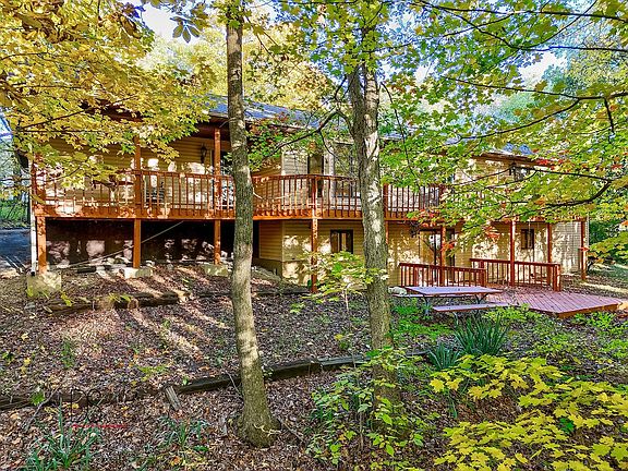 Proudly offering this 5-bedroom, 3-bath single story home with many updates and recent improvements. This spacious and inviting ranch residence greets with a large tile foyer. The heart of the home is an eat-in kitchen, featuring recently refinished solid wood cabinets, a center island, new granite countertops, and updated stainless steel appliances. Sunlight streams in through a skylight, creating a warm and inviting atmosphere. The open concept floor plan seamlessly connects an L-shaped dining room and living room, highlighted by volume ceilings and glass sliders that extend the living space to a multi-level deck, perfect for entertaining and enjoying the outdoors. Three main floor bedrooms including the primary which features a private bath with marble tile flooring, walk-in shower along with a walk-in closet and glass sliders out to the back deck. Main floor laundry room with built-in updated cabinets for great storage and a sink. The lower level walkout space has an L-shaped Rec room and glass sliders to the lower deck, an office/bedroom, along with a workshop and a 5th bedroom. Lower level includes a full bath, ample storage space and workshop area. New flooring throughout including engineered hardwood and carpeting. 1.61 beautiful wooded acres leading you down to the Four Lake Subdivision shared pond. On the wooded property there is also a detached barn style building. Milton Pope Grade school and Seneca High school districts. Don't miss the opportunity to make it your own and experience the lifestyle you've been dreaming of.