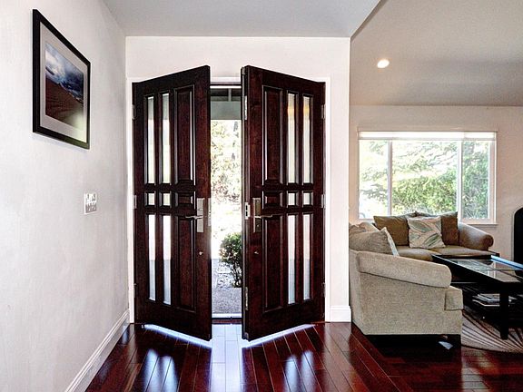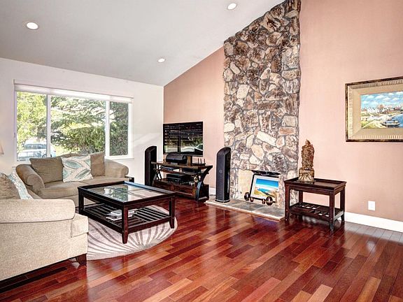Beautiful and updated single story Belmont Heights ranch home is on a view lot offers the breathtaking unobstructed sunrise views of the San Francisco Bay and city lights at night. This home has over $200,000 of improvements including fabulous entry doors, upgraded dual pane windows, and a vast paver surfaced outdoor living area backing up to Hallmark Park. Terraced garden beds. Hardwood floors throughout, designer paint, and modern light fixtures flow throughout the home. The living room and family room each feature a fireplace and vaulted ceilings. NEST security, fire and temperature control installed. The open concept kitchen area offers a walk-in pantry, breakfast bar. The light and open floor plan offers 4 bedrooms, including a spacious master suite with vaulted ceilings and walk-in closet. Laundry room, 3 car garage and plenty of closet, cabinet, and storage space. Excellent Belmont schools, highways 92 & 280, SFO, and nearby Crystal Springs, tennis, and playgrounds.