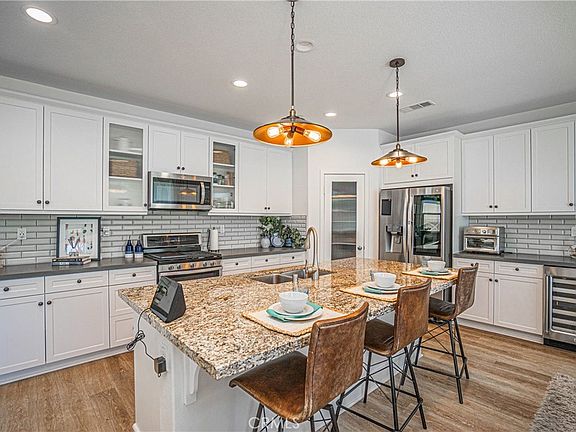 This charming previous Van Daele Model Home comes complete with an abundance of beautiful upgrades, designer selected flooring throughout. White bright designer tones, recessed lighting and light fixtures, custom blinds, remote controlled roller shades, Amazon Home Technology package. The main level living room boasts several windows that allow an abundance of natural lighting to illuminate the open floor plan. It opens up to the kitchen that impresses with white cabinetry, quartz and granite mix countertops, expanded radius kitchen island, pendant lightings, additional custom cabinetry with wine refrigerator. Lots of cabinetry for storage with a walk in pantry as well. The stainless-steel appliances include a single oven range, microwave, dishwasher and newer LG ThinQ refrigerator. The stairs lead to the primary bedroom that over looks the golf course and ensuite bathroom with dual single vanity sink, spacious walk-in shower, Spa style soaking tub and walk-in closet. The convenient laundry room features a utility sink and plenty of storage and has cooling fan to get the hot air out instead of using A/C. Enjoy the huge second master bedroom on the third level with a bathroom or can be used as a game room. Enjoy the cozy backyard with low maintenance artificial turf and decorative planter stand. Direct access to the two-car garage with epoxy flooring and storage shelf on top, two additional reserved parking spaces, tankless water, A/C, ceiling fan in living room and patio, dual pane windows and includes smart home technology. Great location near Cypress, Buena Park, Fullerton, nearby park, new dog park, shopping, restaurants, Dad Miller Golf Course, easy access to 91, 5, and 22 freeways. Looking for a sophisticated Buyer who will enjoy this Home Sweet Home!