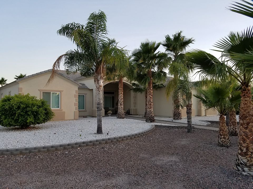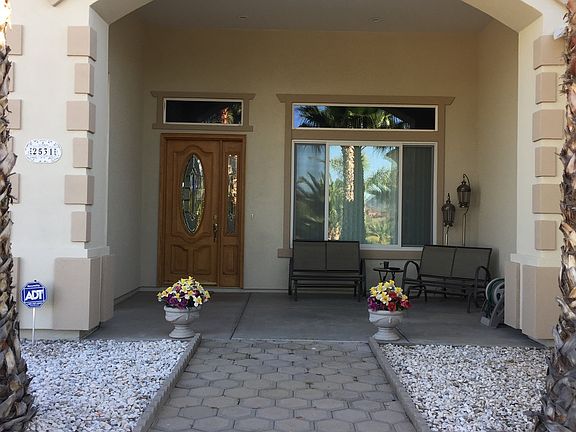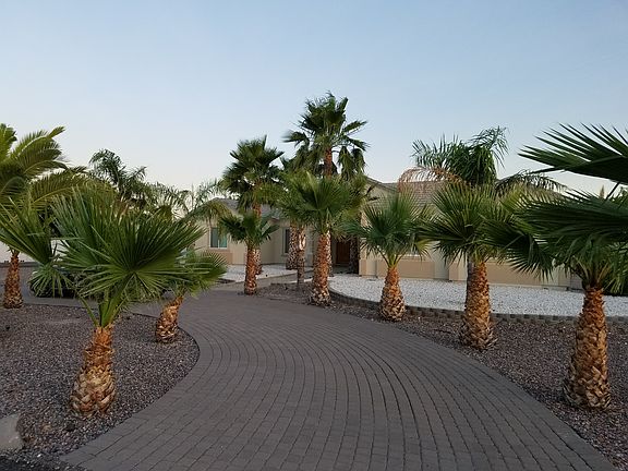 This 1.2 Acre Property has it all! Beautiful palm tree lined, rounded, paved driveway! Kitchen boasts raised panel cabinetry,granite counters, island and stainless steel appliances, butler's pantry an wet bar. Kitchen opens to the family room with fireplace, Extra Large Master Suite has double sinks, large snail shower,jetted tub and dual walk-in closets. Guest bed offers a full bath that is wheel chair accessible & the other 2 share a jack & jill bath w/jetted tub. Travertine flooring, $125k put into this Resort like backyard. Remote Controlled Pebble Tec Pool with Hot tub, water fall, LED multi-colored lighting, faux grass, raised patio with fire pit and bbq. All this wrapped in a travertine deck w/ natural rock accents. Gorgeous Mountain & Sunset Views! Exterior Painted in 2017.