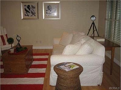 BEAUTIFUL UPGRADED SINGLE FAMILY HOME! Offers spacious living room with brick accented fireplace with mantle and upgraded gas logs, dining room, inside laundry room with linen cabinets, downstairs powder room, recessed lighting with dimmers. Upgraded kitchen with new countertops, double sink and fixtures, refaced cabinets and quiet digital dishwasher opens to family room and breakfast nook area with French doors leading to back patio and yard. Skylight in upstairs hallway; master suite has double door entry, vaulted ceiling, walkin closet lined with cedar, upgraded stone tile shower, upgraded French doors leading to balcony with views of mountain, tennis and basketball courts, swimming pool and spa. Additional two bedrooms have mirrored wardrobes with one of the bedrooms boasting a window seat. Additional upgrades include new windows, new paint inside and out, plantation shutters, laminate flooring, new carpeting, security alarm system, newer roof, garage door and automatic opener, crown molding, front door, outdoor light fixtures, white picket fence and gate.