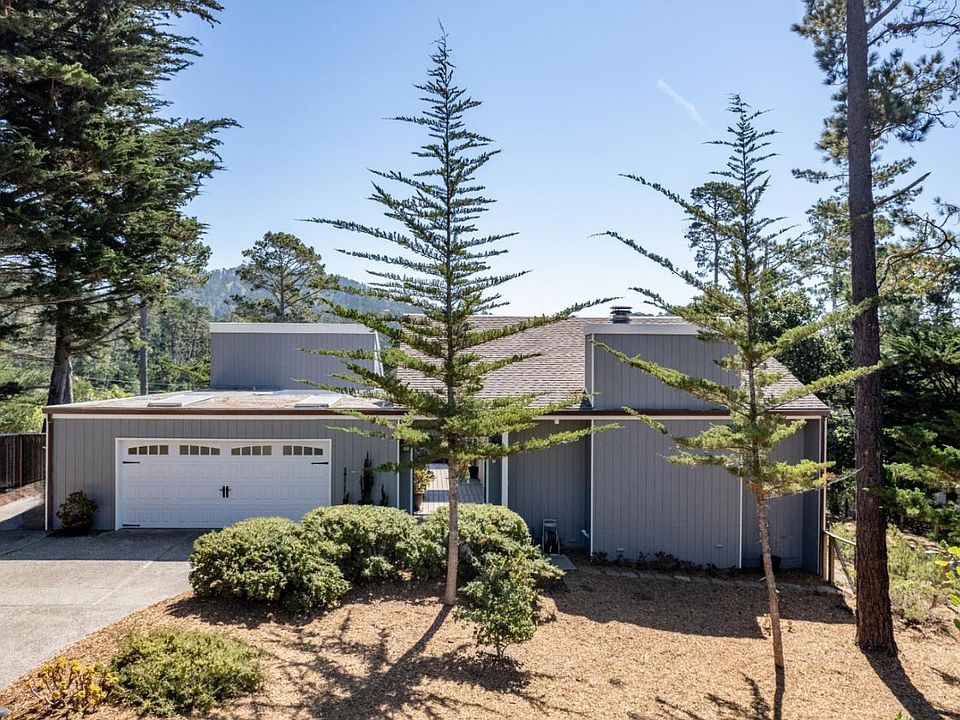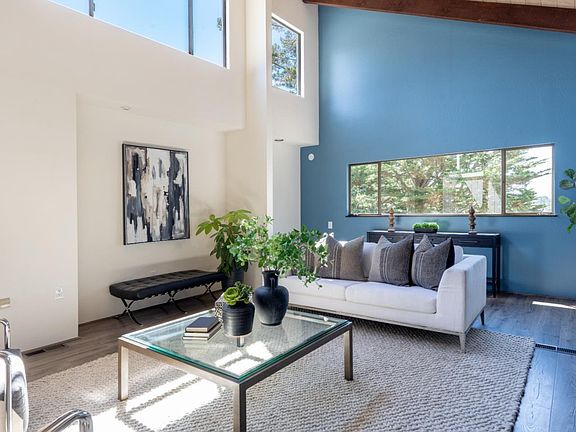 Spacious midcentury modern residence on a 1/2 acre nestled amongst the trees in the desirable Carmel Views neighborhood. Located on a quiet street, this home offers an idyllic retreat with its scenic surroundings and close proximity the local schools, shops, and restaurants. 4 bed, 3 bath, open floor plan, vaulted ceilings, large windows and abundant natural light in family room. Separate living room is an ideal space to enjoy evenings by the fireplace. Centrally located kitchen offers ample countertops for preparing quick family meals or hosting dinner parties. Master bedroom, en-suite bath, and walk-in closet located on ground floor along with two additional bedrooms. Third downstairs bedroom and private entrance offers an opportunity to create a separate studio or guest unit. Outside spaces features a patio courtyard, large rear deck and hot tub. Vast back yard with views of Jacks Peak, and plenty of space for your dream garden. 2 car garage with ample parking & storage space.