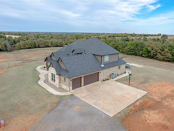 Beautiful custom home on 3 acres MOL. 4 bedrooms, a study, breakfast nook, media room, 2nd living area upstairs with a built-in snack bar area, & sink, 2.5 baths, and has stunning views. This place has an amazing kitchen with a large pantry, island/ eat at bar area, coffee bar/ wine bar with built in coolers for drinks, commercial grade refrigerator that stays, custom cabinetry, granite countertops, an eye catching back splash. Master bedroom/ bath has heated floors. The family room has a stunning stone fireplace that is floor to ceiling, is open & airy with large windows and lots of natural light. Outdoors you will find a large covered back patio, built in kitchen area, and a fire pit. It has it all, including surround sound speakers, and will provide all the opportunities to have family gatherings, get togethers, kids to run/ play, included is access to owner's pond, plenty of room to ride ATVs, and view nature at its best.