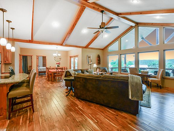 Tucked away on a popular peninsula in Shell Knob called Needle's Eye Point!, you'll find a coveted home remodeled by exclusive local builder Mark Welch with high end finishes and a modern floor plan and outstanding kitchen and baths and closets. There is a vaulted covered front porch with a large deck to gather friends and family on and observe the amazing lake views. Why build? This home was completely remodeled a few years ago and has all the comforts of home, while away from the noise of the city while still being within 5 minutes to grocery stores and shopping! This immaculate 3 bed/2 bath home offers breath-taking panoramic lake views from the family room through the massive picture windows, as well as the master bedroom. Spend your mornings in the family room, bright with huge windows for tons of natural light, cathedral ceilings and open floor plan. Enjoy your meals in the formal dining room or at the dining bar/island in the kitchen! The kitchen has granite counters, bar seating, large pantry, INDUCTION stove top and built-in microwave and oven! This beautiful home is a MUST SEE! and will not last long! It is like a new home! Boat slip available 10 x 24 for just $35000 extra, complete with lift. It is on the dock at the point, second one from the deep end on the left.