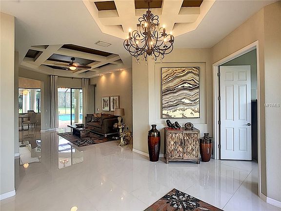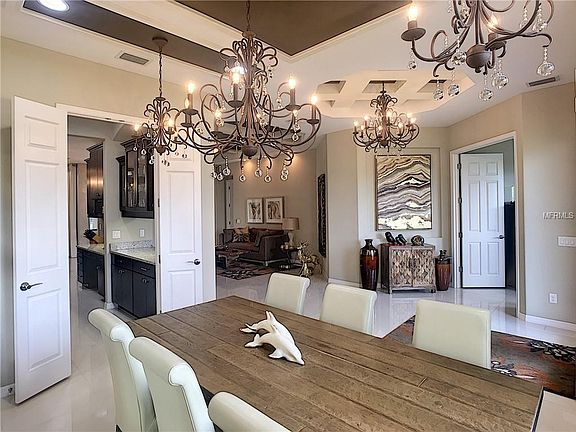 - Interior Features: Ceiling Fans(s), High Ceiling(s), Master Bedroom Downstairs, Split Bedroom, Crown Molding, Walk-In Closet(s), Window Treatments, Solid Wood Cabinets, Eating Space In Kitchen, Built in Features, Stone Counters, Tray Ceiling(s), Coffered Ceiling(s)