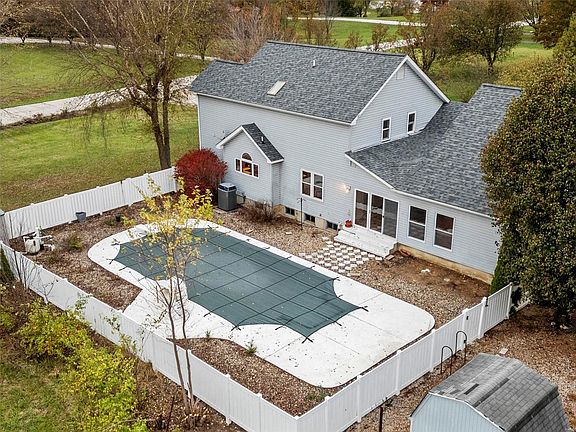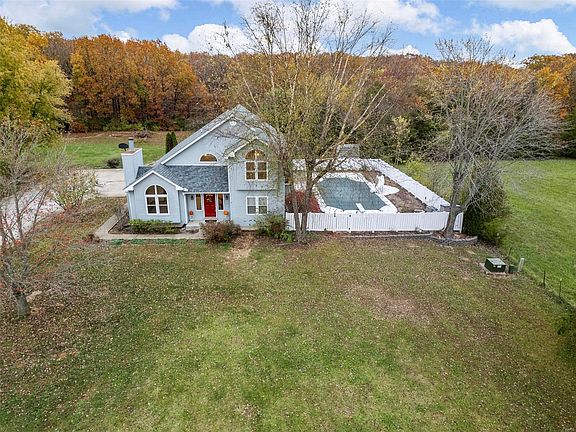 Spacious home on 3 acres 5 minutes from Hwy 70 in Wentzville. Property has an inground pool & for horse lovers, the subdivision is horse friendly. Main floor has a beautiful living room w/ adjoining sitting room & wood burning fireplace for those cozy winter days. Office is located off the entry foyer featuring solid wood floors. Kitchen & breakfast room allow plenty of room for meals & family dining. Breakfast room opens to a large sunroom/family room w/ fireplace & new vinyl plank flooring. Sunroom steps out to the in-ground pool where you can enjoy the patio & the summer outdoors. Second floor features a vaulted primary bedroom w/ a beautiful full view window w/ window seat & updated primary bath. Two additional large bedrooms & bath on second level. New carpeting throughout the home. 9' basement pour w/ rough in bath & sump pit/pump. Attached two car garage is oversized & leads to an additional 10'by20' workshop . Seller is offering an HSA Home Warranty. Additional Rooms: Sun Room