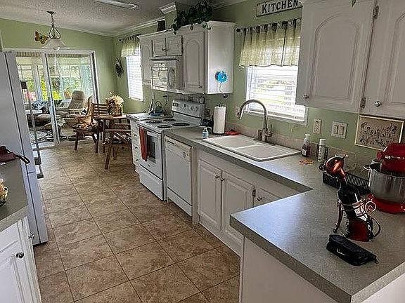 3 BR 2 BA home offers 1512 SQ. FT. Fully and beautifully furnished. 12 X 14 Florida Room to enjoy coffee and a great book. All the work has been done for you AC replaced 2018. New roof in 2022. Home features crown molding, Wood Laminate and tile in Kitchen and baths, Large walk in shower in master bath. Great Florida colors and beautifully furnished, Inside laundry room, Double Drive way and carport an additional 425 SQ. FT. screened Lanai for your outdoor living Large Storage Shed. Home is a must see in a great golf course senior park that offers many amenities. New Gutters. Golf cart with new batteries included.