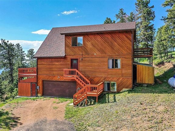 A mountain sanctuary...well-maintained home located on a quiet road with views of the foothills and Pike's Peak. Private, peaceful, and welcoming, enjoy the views from large, floor to ceiling windows or the wrap around deck. Take in the sunrise colors from the private master suite balcony. The great room features vaulted ceilings and a cozy gas wood backed by granite tile. The main floor has 2 additional bedrooms, a full bath and a main floor laundry for ease and convenience. The lower level has abundant storage, a workout/den/tv room, a 3/4 bath and walk out access through the oversized double garage. New carpet and furnace. 50 amps outside of the garage to charge up the RV. Driveway is compacted recycled asphalt. Your furry friends have their own fenced in section of the yard. Deer graze and recline in the shade of the aspens, baby foxes play in the driveway. In the summer wildflowers dot the hillside, in the winter bright stars cast purple shadows under the evergreens. Don't miss out, only minutes to Highway 285 and from Conifer's local restaurants and services.