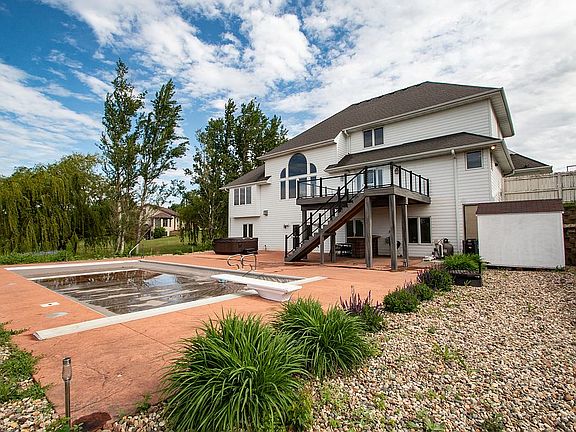 At the end of the cul-de-sac find this 1 1/2 story home with 3 car attached garage and 26 x 54 custom built detached building with 13' door, epoxy floor, furnace and air conditioning, and 220 wiring. Beautiful 18 x 36 in-ground salt water pool with automatic cover (3 years old), newer pool pump and chlorinator (3 years old), and newer heater (2 years old). Pool shed for storage. Pool is surrounded by stamped concrete patio area and landscaping. Pool can be accessed from the deck or the walkout basement. Main floor features MBR with whirlpool bath, tile floor, his/her vanities. 11x16 Walk-in closet. Kitchen features quartz counter tops, double ovens, back splash, and walk-in pantry. Main floor living room has new gas fireplace added recently. Facing will be placed once the buyer chooses stone, brick, or slate to have placed around fireplace and Oak mantel is ready to be installed. Three bedrooms upstairs (2 with WIC). Lower level has 2 additional bedrooms, full bath and family room with 2nd gas fireplace. New gas furnace and air conditioner installed Fall of 2019. MidAmerican for gas, NWREC for electric. Plymouth County taxes and easy access to the bypass. A must see one of a kind home!