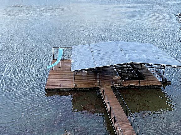 Sitting on the best part of the lake with a quiet cove and breath taking views, this three bedroom, two bath home has two decks and a boat dock with room for your boat and two jet skis