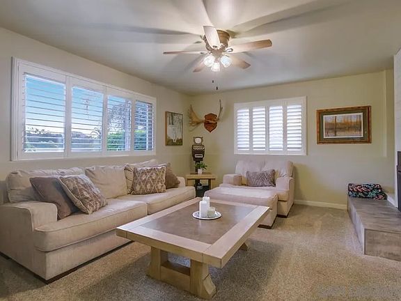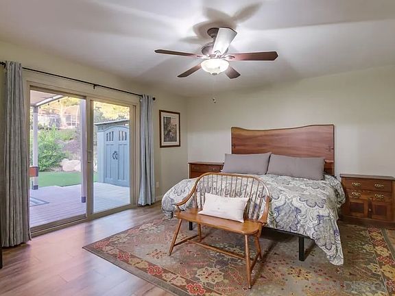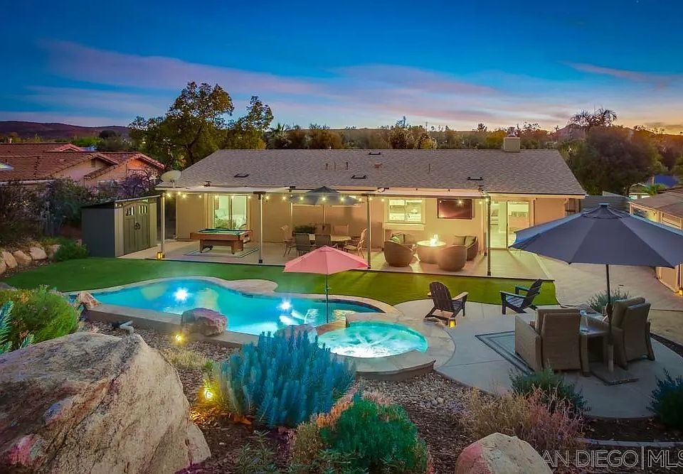 Charming single level home tucked against Mt. Gower in the San Diego Country Estates. A turnkey offering with tasteful finishes throughout this 3-bedroom, 2-bathroom home. Upon entering, you will see the attention to detail and pride of ownership. Stepping down into the cozy sunken living room warmed by a gas fireplace, you will immediately feel at home. Stepping up to the kitchen boasting natural hickory cabinetry, granite countertops, glass tile backsplash, a deep basin sink and stainless-steel appliances you will find yourself planning for entertainment with ease with a large dining area offering lots of natural light and direct access to the outdoor living space. Both bathrooms have been completely reimagined with the primary offering a tiled shower with glass enclosure and the second offering a new bathtub with tiled shower combo. Step outside to your very own private oasis via a large Trex deck with patio cover to a new pebble tech saltwater pool and spa with two water features and a Baja shelf. Beautifully landscaped low maintenance yard with turf, compacted DG and draught tolerant foliage. Near the end of a desirable and quiet cul de sac with no rear neighbors lends to unobstructed views of the hillside. Situated on over half an acre, the property offers the possibility for horses, an ADU and more on the upper tier of the fully fenced backyard with access to the horse and hiking trails. Must see to appreciate this truly special property. San Diego Country Estates amenities include pools, tennis courts, a clubhouse, equestrian centers, golf, hiking trails and more!
