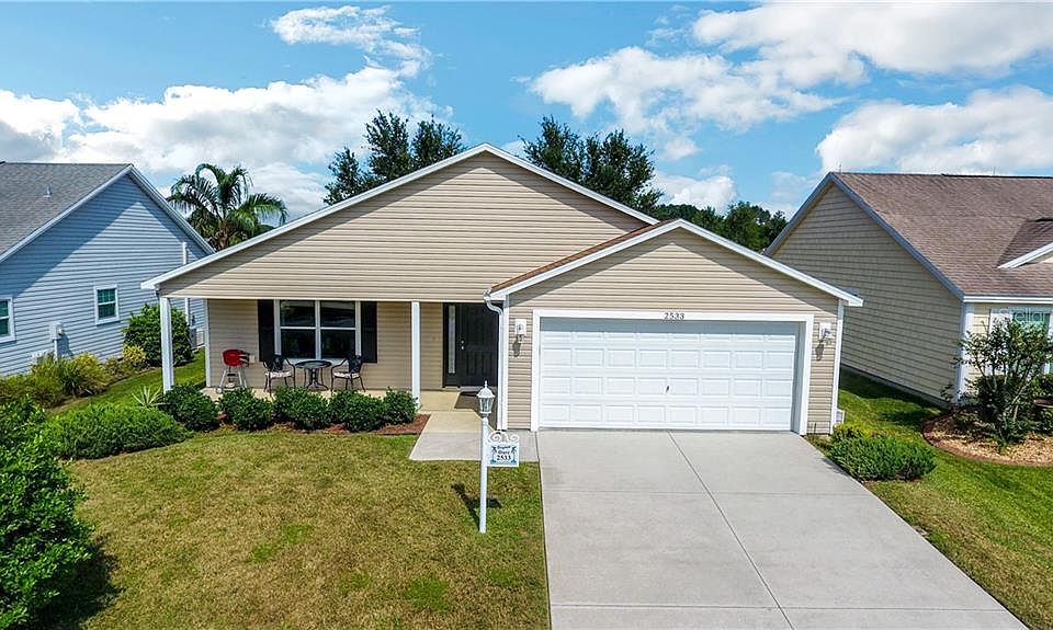 Welcome to this cottage series, 3/2 single family home with open floor plan, volume ceilings, and attractive, engineered flooring throughout the main living area. Over 1,600 sq ft living space with plenty of natural light, a large sitting porch in front and an oversized, painted lanai with green views and privacy in the rear. This unique "Hammock" floor plan is a generous and open layout with comfortable entertaining space and additional seating at the large combination island and breakfast bar. The master bedroom suite includes a full, walk-in closet, double vanities, and a walk-in shower; the guest bedrooms share a full-sized bathroom with a tub and shower in its own adjacent suite. Also included is inside laundry and utility room, and pull-down stairs with extra storage in the 2-car garage. This lovely home is nestled in the sought after Village of Buttonwood with easy access to nearby golfing, recreation centers and pools as well as equal distance to Brownwood Paddock Square and Lake Sumter Landing. Seller is offering $3,500.00 at closing toward new kitchen appliance package! This house has been gently lived in and well-taken care of. Great neighborhood with organized activities. Bond balance is $15,739.17. Please don't hesitate to call for your showing today!