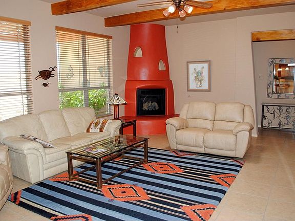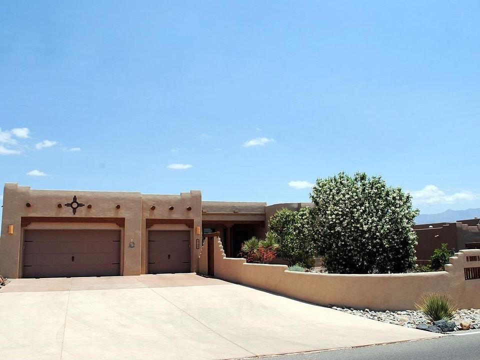 New Mexico Pueblo home includes classic southwest features with lots of custom details. Nichos, wood beams, warm kiva fireplace, stunning tile. Modern kitchen includes large pantry, natural light & bar. Luxurious master suite a perfect getaway to relax. Separate shower. 3 car garage with work shop area. Enjoy outdoor living with sweeping views of mountains & city lights. This soothing sanctuary embraces all the best of southwest living. Plenty of room for RV. Pet free house.