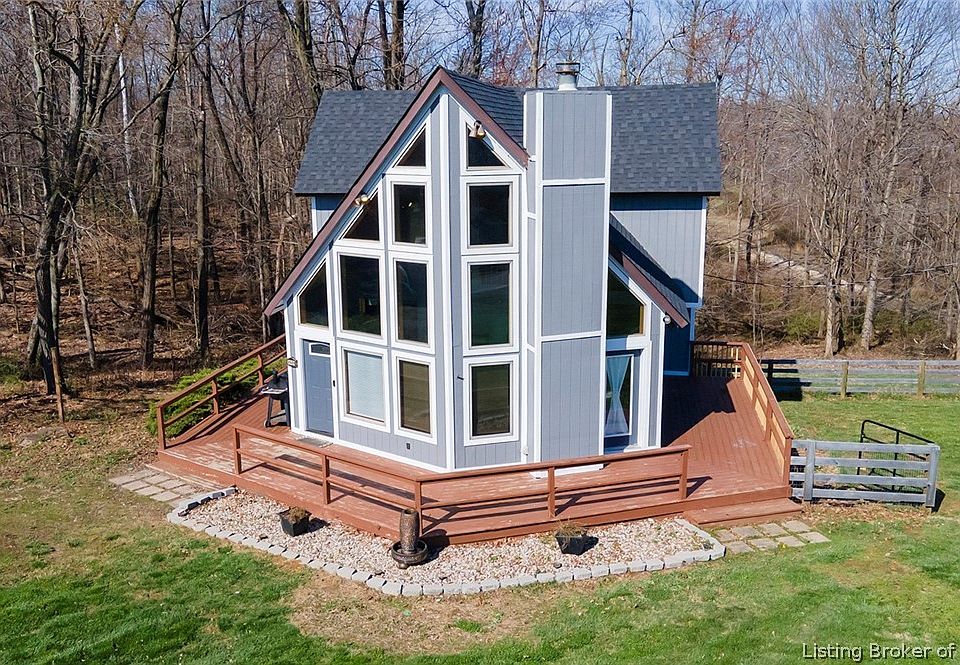 This unique A-FRAME with a wraparound deck sits on 2 wooded parcels totaling 6.08 ACRES. There is a two car detached garage with smart garage door openers. There are 3 bedrooms and 2 full baths, one being a first floor main bedroom suite with a walk in closet and luxury vinyl plank flooring. The kitchen has been updated with a FARMHOUSE SINK, backsplash, countertops, stylish ceiling fan, luxury vinyl plank flooring and all the kitchen appliances will remain. The washer/dryer will remain in the first floor laundry. One of the 2nd floor bedrooms has two extra large walk in closets & storage. The ROOF is approximately two years old, hot water heater was new in 2020. The sellers have never used the wood burning fireplace. The side yard is partially fenced and there is a CHICKEN COOP. The lower level is currently used for a gym and storage, but would be a great STORM SHELTER.