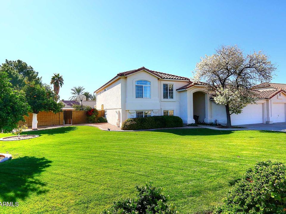 ***SIGNIFICANT PRICE REDUCTION***All the right spaces found in this bright, well-maintained, tri-level home located in NON HOA neighborhood. The spacious lot dotted with several citrus and other fruit trees, vegetable garden space, large covered patio, backyard flood irrigation and RV gate. Oversized front covered patio graces the entryway leading to split bedroom and living areas. New roof and water heater installed January 2023, newer HVAC units, new upstairs carpeting. Large walk-in storage area in the basement. Pre-listing inspection report available. Located within Mesa's finest schools and convenient to the 202. Don't miss this one!