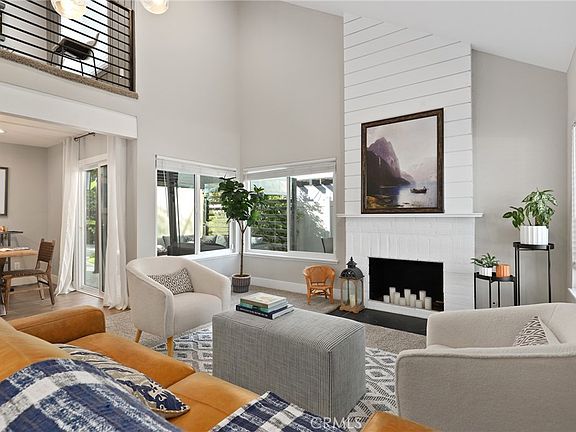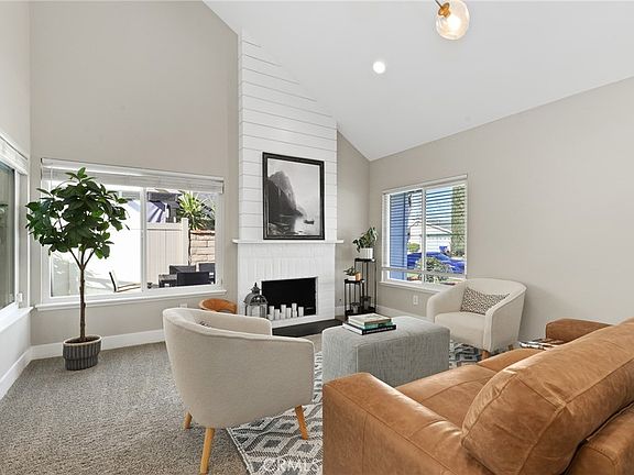 Upon entering, you’ll be greeted by a spacious, open-concept living room with soaring ceilings and a cozy fireplace, flowing seamlessly into a dining area. Traverse through the doors to your private outdoor patio, perfect for evening gatherings and making memories with loved ones.