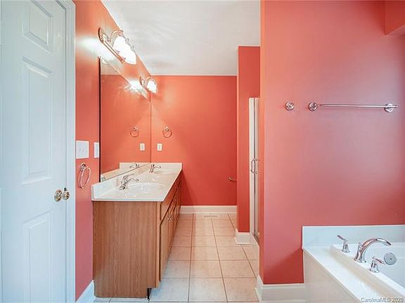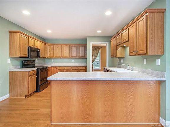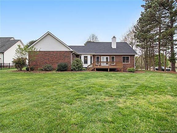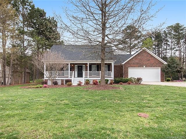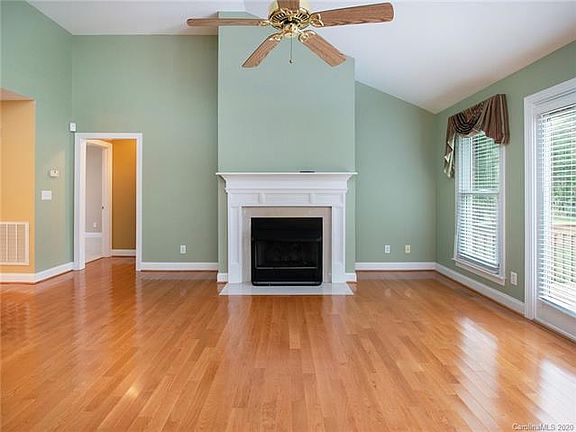 This Charlotte one-story home offers hardwood flooring, a kitchen breakfast bar, a fireplace, a walk-in closet in the master suite, and a two-car garage.