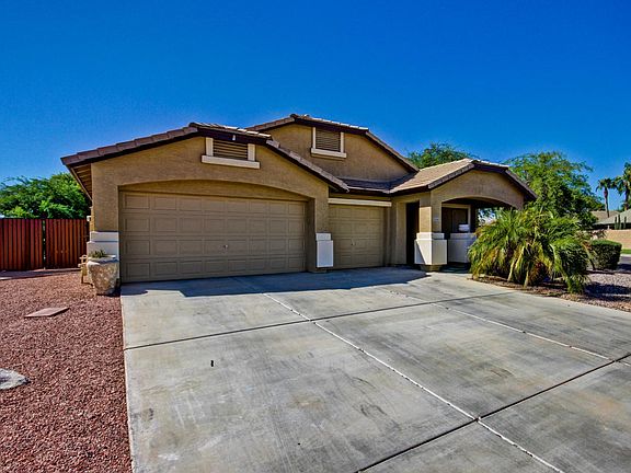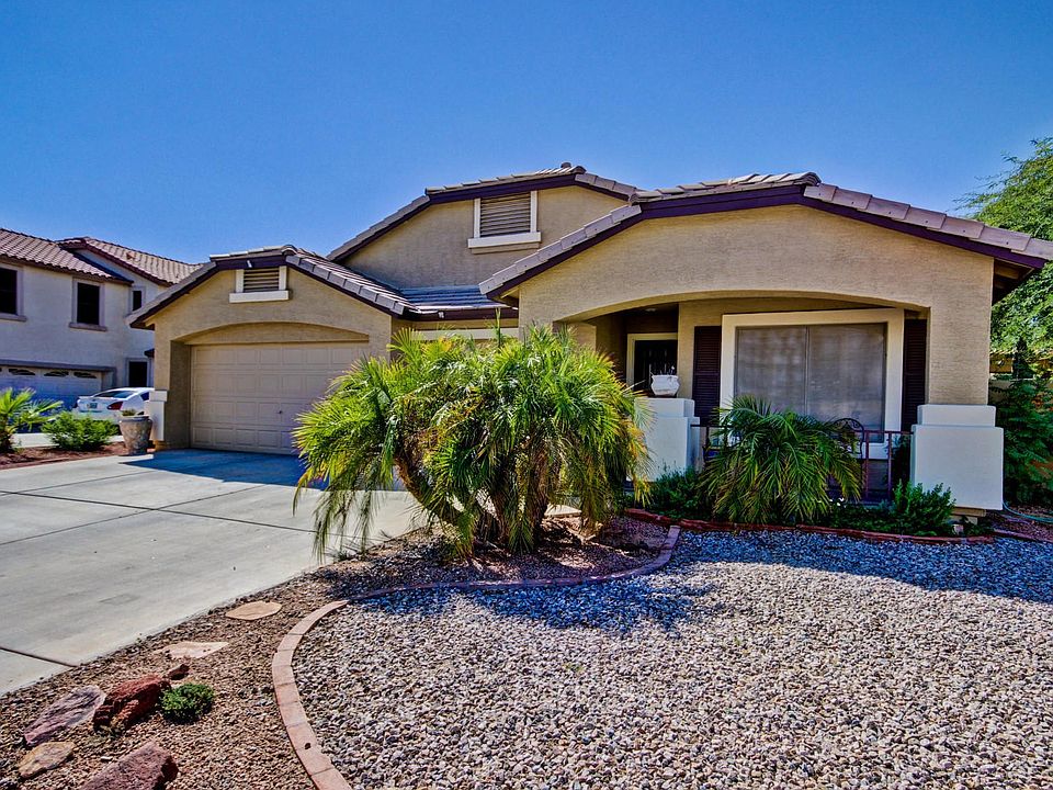 Great corner lot with a large back yard. 18'' tile and custom paint throughout. Kitchen with a walk in pantry, travertine backsplash, granite countertops, and an island. Plantation shutters, wood blinds, and vaulted ceilings throughout. The family room has french doors that open to the nice back yard with a spa, extended covered patio, and a shed. The 3 car garage has a workbench and storage. This property is located across from a lake and close to schools, Westgate, the I-10 and the 101. This property has a new hot water heater, A/C, carpet, exterior paint, and spa motor.
