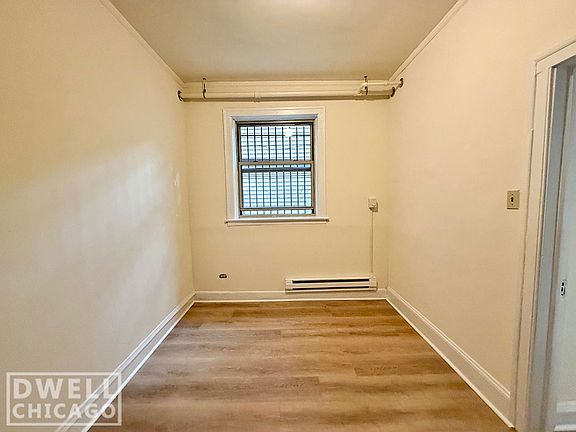 Located in central Logan Square, this one-bedroom apartment sits on a quiet block near the Blue Line station and Milwaukee Avenue. The building features an elevator, secure intercom entry, security cameras, a laundry room, and bike storage.
