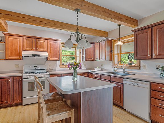 Perched in the scenic hills above Hinesburg, this stunning post and beam home is truly one of a kind. Set back well within over 12 acres of land, the property will give you a sense of peace and privacy as soon as you arrive. Enter the home through the wrap-around front porch or the attached 2-car garage, and you’ll find a bright foyer with plenty of storage. Stepping into the kitchen, you'll discover a well-equipped space that opens to a large dining area featuring soaring post and beam ceilings and large windows overlooking fields and mountains. The dining space leads to a warm and inviting living room with a wood stove and a cozy family room perfect for relaxing or entertaining. Upstairs, there are 3 big bedrooms, including a primary suite with an ensuite bath and an attached office. The other 2 bedrooms each feature extra loft space above them, taking advantage of the ceiling height and adding unique character to the home. The acreage includes a beautiful mix of fields, woods, a stream, and mountain views. Located just minutes from Hinesburg amenities, this property combines tranquility with convenience, making it a perfect retreat or family home. Don't miss the chance to own this extraordinary property! Open House Saturday and Sunday 11-2.