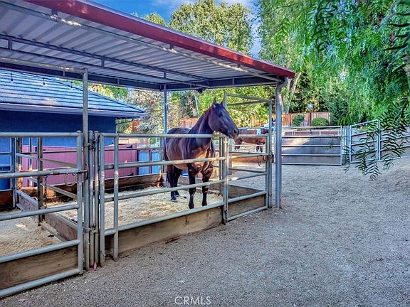 Equestrian enthusiasts will appreciate the well-appointed facilities, including a turn-out ring, 3-horse pipe stalls with tack and feed sheds, hot/cold water wash rack and direct trail access, ideal for training or exercising horses. The expansive grounds provide ample space for additional equestrian activities or outdoor recreation. The luxurious pool area with outdoor fireplace is perfect for entertaining or relaxing in the sun, and the professionally landscaped gardens create a welcoming, peaceful retreat.