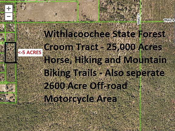 5 Acres ON Withlacoochee State Forest - Croom Tract 4 Bedroom 2 Bath Pool Home 5 Hard to find acres ON the Croom Tract of the Withlacoochee State Forest Withlacoochee State Forest declared by the World Wildlife Fund as One of the 10 coolest places in North America .... Withlacoochee State Forest - Croom Tract - 25,000 acres with separate horse, hiking, off road bicycling trails - also a separate 2600 acre off road motorcycle area 4 Bedroom 2 bath 1600 sf home with a beautiful stone fireplace Pool 4 Stall stable