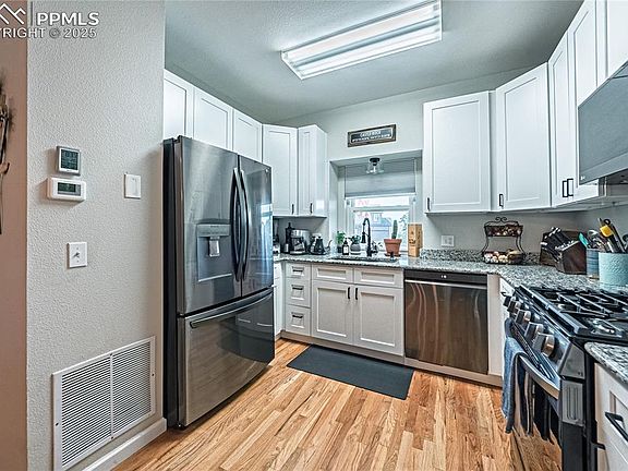 Don’t miss this beautifully updated home located just off the Powers corridor and tucked into a quiet cul-de-sac. Boasting a gorgeous kitchen complete with black stainless steel appliances, a gas stove, granite countertops, a neutral palette and mountain views out the kitchen sink window, you are sure to feel right at home. The open-concept living area complete with vaulted ceilings and subtle upgrades leave plenty of space for your unique touch. Continuing upstairs, the large master bedroom with attached full bathroom and walk-in closet is the perfect place to relax. Two additional bedrooms, a full guest bathroom and linen closet finish off the upper level. Recent high-quality upgrades to interior hardware, window coverings, and light fixtures continue throughout the home. The lot features new front landscaping, mature trees, a huge back deck, and additional parking beside the driveway for a camper/RV/trailer or whatever needs you have. The whole finished interior was repainted in 2023 along with a full roof replacement. There is so much to enjoy both indoors and outdoors in this wonderful home and neighborhood with no HOA! Schedule your showing today!