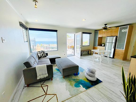 Now available. Furnished, single-level 2 bed 2 bath home with magnificent ocean views. The unit is 1250 sq ft + 1000 sq ft private deck. 10 mins walk from beach, lagoon, grocery stores, and more. Features: * Ocean View: Breathtaking ocean views from nearly every room of the house. * Furnished and Ready to move in: Bedroom, dining room, living room, outdoor deck (for exclusive use of the tenant), kitchen appliances (dishwasher, fridge, stove, oven, microwave, toaster, etc.), and office furniture all included. * Office Setup: High-end office furniture, including a standing desk and a premium Hague chair. * Fully Equipped Kitchen: The kitchen comes fully equipped with modern appliances and dishes * Massive Deck: The front entrance opens to a massive deck, featuring a dining table, a sitting area, and heaters. * Parking & Laundry: Two dedicated street parking spots in front of the house and convenient onsite laundry facilities. Location: * Proximity to Amenities: 10 min walk to a variety of restaurants, grocery store, cafes, and shops, offering you dining and shopping options. * Beach & Nature: Enjoy the best of coastal living with the beach and San Elijo Lagoon just 8 mins away. * Wonderful neighborhood: the space is located on a quiet dead-end street for privacy. Gardening and high speed internet included in the rent. Pets welcome with pet cleaning fee + deposit. Rental Requirements: Flexible Terms: Available on a month to month basis until June, possibly longer. $5,500-$8,500 depending on the length of stay. Income = 2 1/2 times the rental amount. Reference and Credit Check Required. Credit = FICO scores 650+, no legal evictions (no exceptions, sorry) None smokers only.