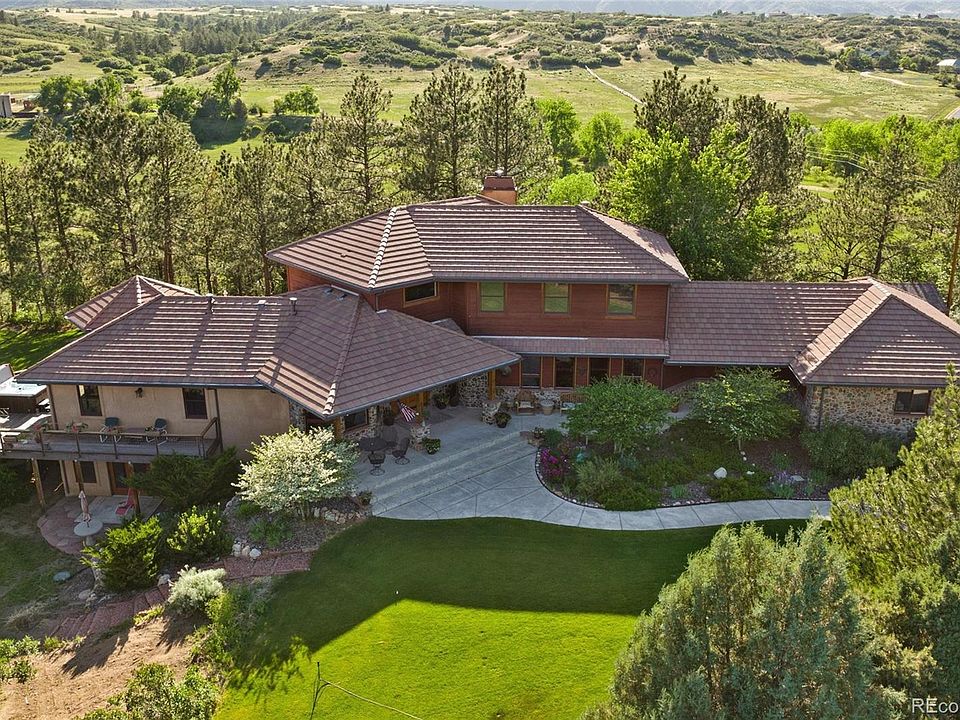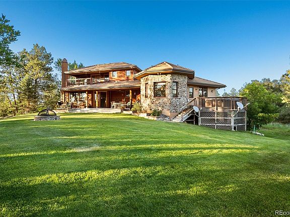 Beautiful custom home located in Sedalia. This 7.4-acre wooded lot overlooks West Plum Creek and the Front Range. You will appreciate the Brazilian cherry hardwood floors, slate entry, custom light fixtures, and stained glass. The spacious great room includes a beautiful stone wood burning fireplace. The chef’s kitchen features custom cabinets, slab granite countertops, 6-burner stove, refrigerator, two ovens, vegetable sink, large island, trash compactor, desk area with built-in cabinets and walk-in pantry. Entertain guests in the large formal dining room. Primary bedroom has an oversized walk-in closet, gas fireplace, large 5-piece primary bath, and access to the private deck with hot tub. The main floor also features a study with a gas fireplace, bedroom with an ensuite full bath with walk-in closet, powder bath, laundry room and mud room. The second level features a home office with built-in cabinets, wet bar, bedroom, and full bathroom. From the office, you can access the upper deck and appreciate the incredible views. Walk-out basement includes a bedroom with ensuite full bath and two bonus rooms that could be used as a recreation room or media room. Mechanical room has built-in cabinets. The exterior features a porch, landscaping, front and backyard lawn with irrigation, and treed for privacy. You will enjoy the backyard fire pit, and the views from the rear deck that sits atop the bluff. The school bus stops at the end of the driveway.