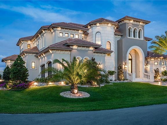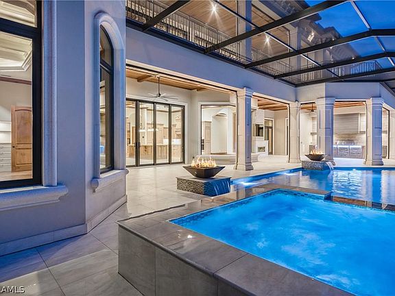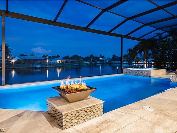 This one-of-a-kind new custom home blends a modern waterfront elegance with old world class. Outdoor entertainment is brought to life with a stone-faced fireplace topped by an oversized flat-screen TV, fire bowls and fire pit which illuminate the pool, pool deck and spa and a full outdoor kitchen which all overlook one of the largest canals in Cape Coral (around 150 across and 28+ deep). The outdoor living space flows seamlessly into the open grand room, creating an amazing area to take full advantage of the Southwest Florida lifestyle. Inside, marble and hardwood floors extend out before you while custom wrought iron and coffered ceilings amaze above. Custom cabinetry and dual oversized islands adorn the kitchen along with Sub Zero and Bosch appliances and countertops of quartz, granite, and marble. The walk-in pantry boasts a wet sink and dishwasher. The expansive master suite is on the first level. Your guests will enjoy the entire second floor complete with a spacious loft with custom built ins framing a 98" television, a private outdoor living space and wet bar area. All of this comes to life with the push of one button using the fully integrated home automation system.