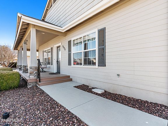 This house features a spacious layout with three bedrooms and two bathrooms, perfect for family living or hosting guests. The high ceilings create an open feeling throughout the home, enhancing the open floor plan and natural light. The kitchen includes stainless steel appliances. There is a large island as well as a great pantry! The master suite includes a large bathroom equipped with both a soaking tub and a walk-in shower, offering a relaxing retreat. Outside, the property is beautifully landscaped in both the front and back yards, providing attractive curb appeal and outdoor spaces for enjoyment. The back covered patio is ideal for gatherings or relaxing, while the front covered deck adds charm and functionality. Situated in the quiet neighborhood of Brightstar in Chino Valley, this