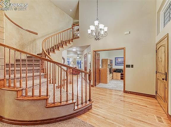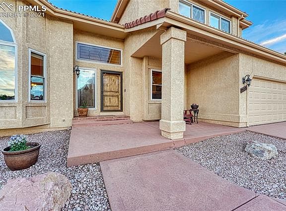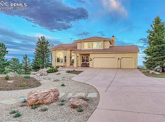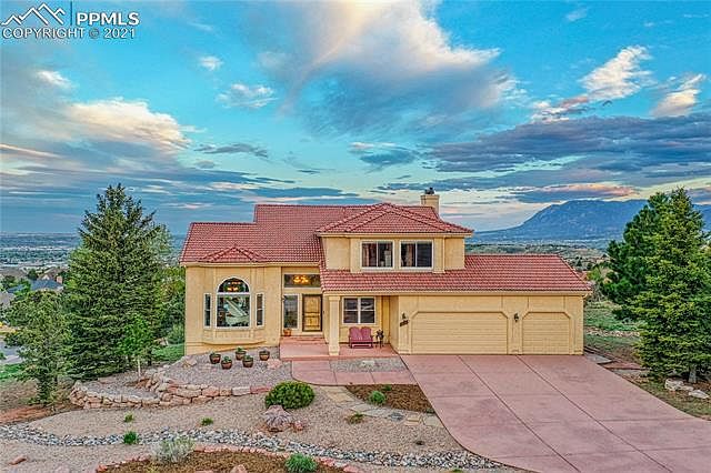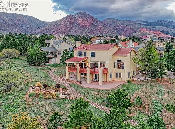 Pristine 5BD;4B;3CAR 2-story with finished walkout basement on one of the most beautiful lots in all of Mountain Shadows. 1.16 acres with STUNNING views from every window in the home. Amazing panoramic views from the expansive, partially covered deck w/fireplace & ceiling fan. Loaded with luxury finishes & landscaping including tile roof, 3-drop waterfall w/pond, finished garage w/wash basin, new furnace & A/C in 2019 and a radon mitigation system. A grand, rounded staircase provides an impressive backdrop to the entry, living & dining rooms. The aptly named "great room" is grounded by a stately brick gas fireplace and features the walk-out to the deck with its panoramic views. The kitchen boasts wood floors, double oven, slab granite countertops, a pot rack (in storage), ample counter & storage space, message center & a double door pantry. The electric cooktop in the counter bar island is already plumbed for gas. Refrigerator included! A designated home office features wainscoting, double doors and ceiling fan. The master retreat offers gorgeous views, a vaulted ceiling, ceiling fan, three-sided gas fireplace and bay window. Find your way to relax in the soaker tub or walk-in rain shower w/multiple heads ~ a double vanity, gorgeous granite countertops, a wall heater in the water closet and a spacious walk-in closet complete the space. Additionally, there are 2 bedrooms and another full bath upstairs. Downstairs, the finished basement features above-grade windows, abundant natural light and a 35' x 18' gathering space. Views continue from the basement walk-out and large, partially covered cement patio. The 2 basement bedrooms also provide wonderful views & closet space. The bath features a copper sink, tile floor and custom tile work. Finally, the 16' x 11' storage space is a real plus. All will appreciate the functionality of this location with trails, parks, outdoor activities, Garden of the Gods and Pike National Forest easily accessible.