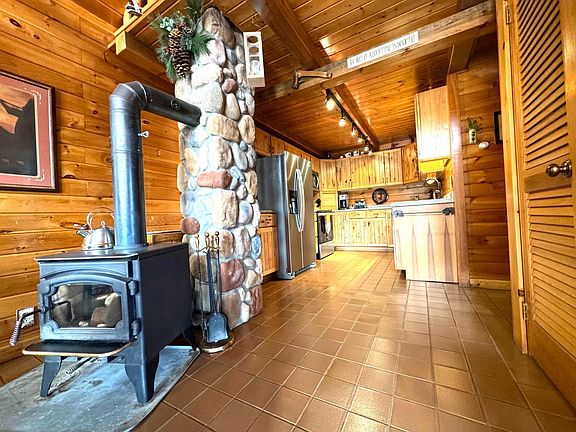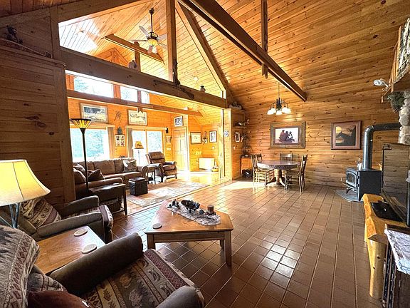 Lakefront paradise in the Northwoods. Offering serene privacy, this 10-acre property has a mostly level slope to a swimmable sandy shoreline, perfect for endless summer fun. The natural woodwork, vaulted ceilings and wood burning stove greets you with a warm hug as you step inside. Embrace main level living with 2 bedrooms, a newly remodeled bathroom, and a loft opening to a deck with expansive lake views perfect for relaxing. Storage will not be an issue with 2 newer pole buildings and a front patio leading to the heated 2-stall garage that includes a bar and extra space for guests. The roof on the home and garage have recently been replaced in 2022 and have charming ½ log siding. Outdoor enthusiasts rejoice with nearly 1000 ft. of lake frontage, direct access to ATV and snowmobile trails, and ensuring your oasis remains tranquil it borders public land with exploring and hunting opportunities. It's time to own your private retreat with the comforts of home and endless adventures!