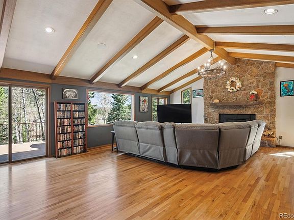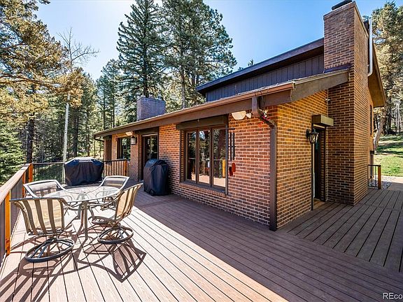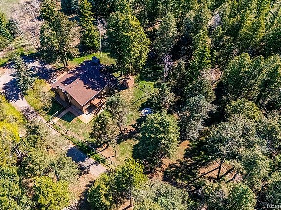 This gorgeous mountain home on 3.27 acres is one of a kind with a short commute to C470 & 285 which allows one to live the best of both worlds. The home itself has an expansive living room with vaulted ceilings, beams, a floor to ceiling fireplace, hardwood floors and soft, natural light overlooking the treed lot. The kitchen will excite the chef in anyone and includes a large island, granite counters, a built-in oven and microwave, a cooktop and extensive cabinetry. The primary bedroom provides access to a private deck, a gas fireplace with thermostat, a walk-in closet and a secondary closet. The ensuite primary bath features a walk-in shower, a sunken soaking tub, radiant heated floors and granite counters. The study is tucked away from it all with natural light and incredible views. The sizeable secondary bedrooms are located on the lower level separated by a large bathroom with ample cabinetry, heated tile flooring and a custom vanity with granite counters. The furnace and water heater are newer as well. This home truly is one of a kind and has been extremely well cared for. A three stage whole house water filtration system, radon mitigation system, snow blower and patio furniture are included. A seasonal stream and waterfall offer soothing sounds of running water in your own back yard. In addition, enjoy your own private trail and the convenience of 3 sheds. A stunning composite deck with metal railing was installed in 2022 off of the living room and invites one to lounge or entertain. A new roof was installed June of 2024 with Malarky Vista class 4 shingles. The gutters on north side of home are heated. The garage overhang is considered a dry space (water is captured from the deck and drained off to the side) which prevents ice and snow build up and allows for covered parking for two vehicles in addition to the oversized, attached two car garage. When you step away from your piece of paradise, you will find Meyers Ranch and Conifer conveniences minutes away.