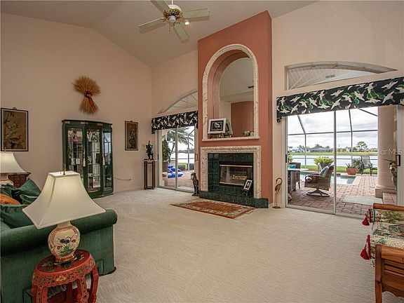 DEEP CREEK EXQUISITE AND PRISTINE CUSTOM BEAUTY W/FABULOUS LAKE VIEW! Enjoy spectacular views of Lake Zappa from almost every room in this spacious, 4 bed/2.5 bath, lakefront home in Deep Creek. Step into a formal living room & dining room w/views out to the lanai & lake beyond. The living room features a wood-burning fireplace w/marble & coral stone surround. The large mirror over the fireplace reflects tons of light enhancing the natural light throughout the room. Architectural details include soaring cathedral ceilings, decorative plant/display shelves & arched transom windows. The kitchen boasts granite & tile counters, a center island & breakfast bar. Kitchen & breakfast area open to a large family room w/disappearing sliding glass doors to lanai & picture windows overlooking the lake. The master suite offers walk-out access to the lanai plus two, walk-in closets. The master bath features dual sinks, glass-enclosed shower & linen closet. Split bedroom floor plan offers 3 large guest rooms - two of which are configured as a guest suite w/private, sitting room. The guest bath has been beautifully-updated w/dual sinks & modern fixtures. Outside, the lanai has a beautiful, brick paver deck w/extra large, in-ground pool. Pool was resurfaced in 2018 & cage rescreened in 2016. Other outdoor features include outdoor shower & pool bath. Sit on the lanai while enjoying the lovely lake view. Southern rear-exposure guarantees sun on the pool throughout the day plus views of colorful sunrises & sunsets over the lake. Updates include new A/C (2017) & Ring doorbell/security system that stays with the home. Other amenities include attached, two-car garage, brick paver driveway & lush tropical landscaping. Inflatable sail-kayak with 2 seats and oars included in sale for immediate of enjoyment of large lake.