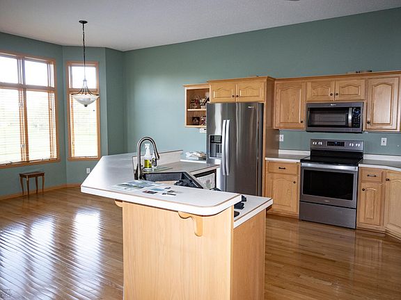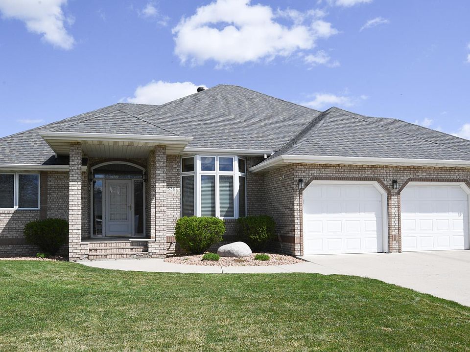 ceilings, kitchen with island breakfast bar, separate eating area. Entry is large and embraces full view of living room & park. Gas fireplace in living room. Large primary bedroom & private bath. Basement rooms are finished & large. Lots of storage space. Heated garage. New Shingles!