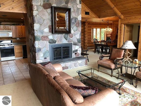 Quality-built log home with 100 ft of private frontage on PORTAGE LAKE, which leads out to LAKE MICHIGAN. If you're looking for privacy, this is it. No neighbor on one side (a rare find for waterfront), and views of the Portage Point Inn. Four large bedrooms, three full bathrooms, spacious-open feel throughout, an attached two-car garage and two beautiful, stone, natural gas fireplaces; one on each floor. Central Air is ready for your summer relaxation. And the enormous deck is ideal for watching the wildlife and the stars. Lots of room for parking for all of your friends and family!! You must see this one in person. And if you've seen it once, you should take another look. (Ideally located between Arcadia Bluffs, Crystal Mountain and Manistee's Meijer.)
