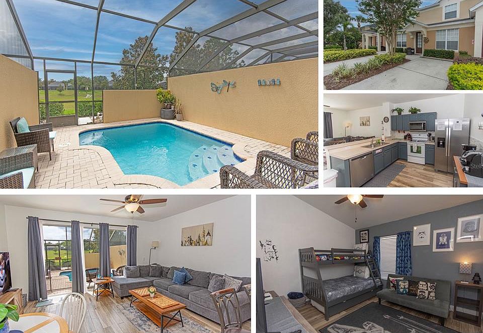 You deserve to live the vacation lifestyle in one of the most sought-after communities that is just 3 miles from Walt Disney world. Once you tour our updated 2 story townhome that features your own west facing enclosed swimming pool that showcases truly amazing sunsets while overlooking the tree lined conservation view in the distance for ultimate peace and quiet. The home will be offered fully furnished and turnkey rental ready to seamlessly continue to generate rental income when you are not staying in your home. As you enter the foyer you will see the upgraded tile flooring throughout the home and leading you towards the freshly updated open kitchen with newer appliances and stylish coffee bar. The living room comes with new furniture, nice dining area and with the view of your private outdoor patio area and pool. On the main floor you will find one of the bedrooms with a connection bathroom as well as plenty of storage closets. Once you adventure upstairs you will find the Star Wars themed room with bunk beds and additional sleeping space pull out, a comfy sofa sitting area, and private bathroom. The master suite features high ceilings, new bedroom furniture and private bathroom with soaking tub. Pool has recently been resurfaced as well as a new pool heater installed. Windsor Hills is a gated resort with world class amenities that include double Olympic sized pool, spiral water slide and hot tub, clubhouse with billiard room and video arcade. 40-seat movie theater, marketplace and grill, tennis courts, basketball court and volleyball sand court, putting green, picnic and BBQ area, castle themed playground, fitness center, 24-hour gated community security.