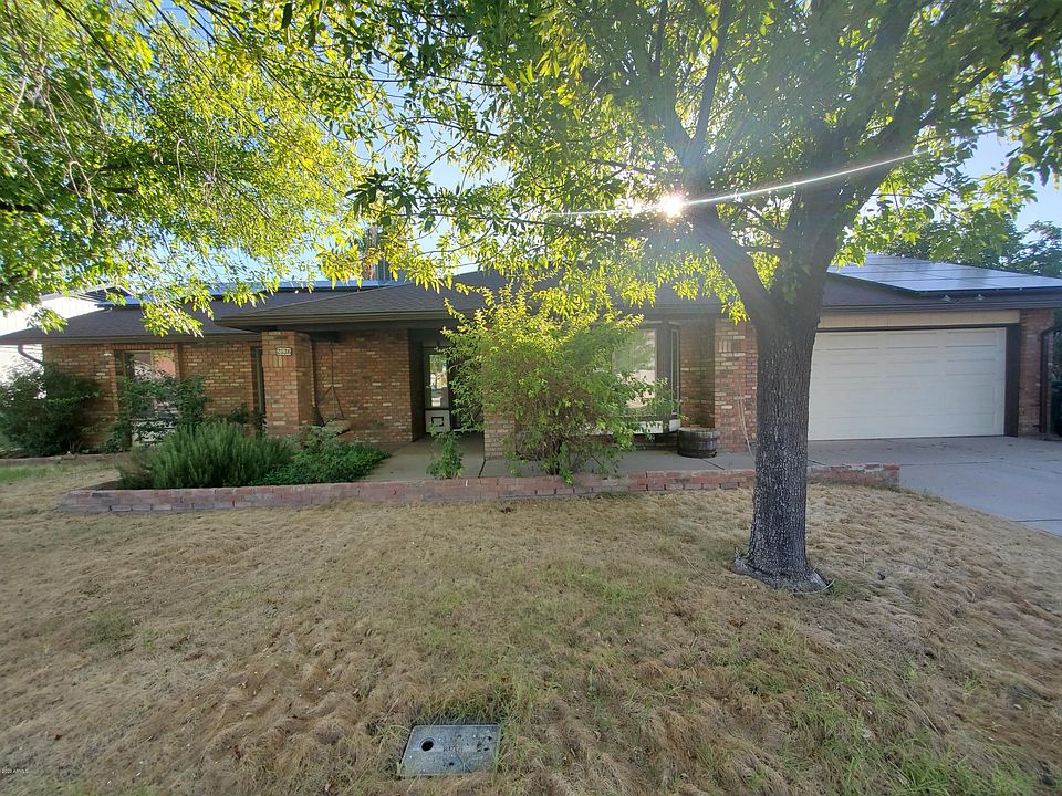 ABSOLUTE CURB APPEAL! Renovated throughout in 2020! NO HOA!! Cute brick front home with mature trees, lawn and courtyard entry with swing. Step inside to a 4 bedroom, 2 bath very functional floorplan. Completely tiled throughout with wood look tile! You will love the Granite Countertops, Fresh Interior Paint, Dual Pane Windows, Real Wood Burning brick fireplace and spacious rooms. The back yard is lush and beautiful with the resurfaced Pool and Extensive Travertine Decking. Home is also equipped with solar!!