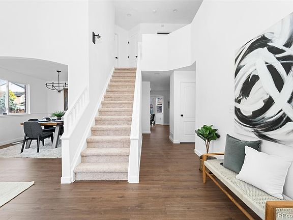 Sheer luminosity abounds in this meticulously remodeled Eastlake Village home. Positioned south-facing on a cul-de-sac, a welcoming exterior draws residents into a bright and airy layout flowing w/ high ceilings and handsome flooring. Gorgeous natural light streams into a formal living room through large windows. A curved archway leads into an elegant dining room illuminated by a contemporary light fixture. Warmth emanates from a cozy fireplace in a spacious living room. A bright dining area extends into a kitchen featuring new stainless steel appliances, granite countertops and all-white cabinetry. Open a sliding glass door to reveal access to a patio in an expansive, fenced-in backyard. Vaulted ceilings expand the scale of a sizable primary bedroom w/ a serene en-suite bath featuring a walk-in shower, soaking tub and dual vanity. Three additional bedrooms and three baths offer plenty of space flexible to new residents’ needs. The unfinished basement presents a blank canvas, perfect for creating additional living or entertainment area to suit your lifestyle. Additional storage is found in a two-car attached garage. Located just steps away from East Lake Shores Park and a few miles away from i-25.