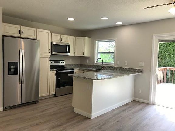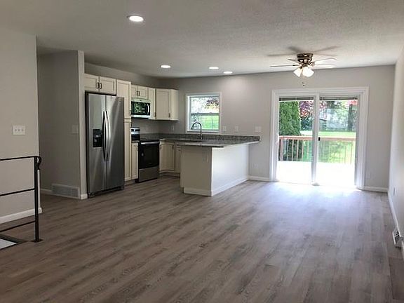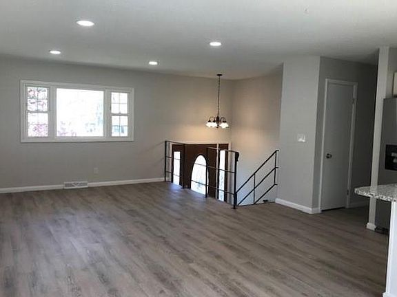 Gorgeous-all in today's colors ! New Kitchen solid surface counters w breakfast bar area /new cabinets /stainless steel appliances open to dining area complete w new patio doors to wooden deck & fenced yard. Spacious living room w new flooring & recessed lighting & open staircase. Bright cheery bathroom w new vanity & ceramic tub shower. Lower Lvl offers Family Room /or a 16 x 11 Master Bdr w 7 x 7 closet just steps away from new full bath and separate laundry room. Central Air. Roof new 2019